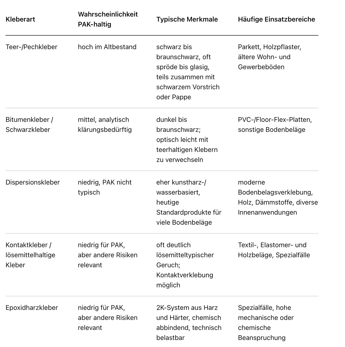 Klassisch betroffen sind Kleber unter Mosaik- und Stabparkett sowie unter Hirnholz- oder Holzpflaster. Daneben nennen offizielle Bestandsdatenbanken auch Linoleum-, PVC- und Elastomer-Bodenbeläge als mögliche Fundstellen PAK-haltiger oder PAK-verdächtiger Kleber. Besonders heikel sind alte schwarze Kleberschichten unter Floor-Flex- bzw. Vinyl-Asbest-Platten, weil dort neben PAK auch Asbest vorkommen kann. Wer also PAK Kleber erkennen will, muss immer parallel an Asbest und andere Gebäudeschadstoffe mitdenken.
