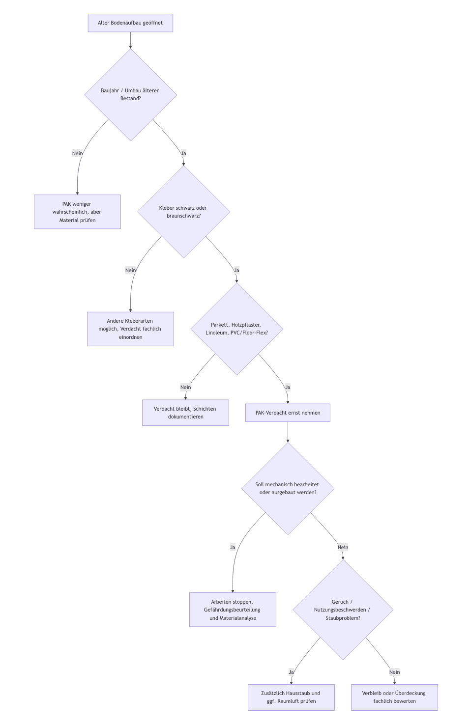 Für die Erstentscheidung auf der Baustelle ist folgende Reihenfolge fachlich sinnvoll: Baujahr prüfen, Belag und Schichtaufbau dokumentieren, dunkle Kleberlagen als Verdacht einstufen, Bearbeitung stoppen, Probenahme planen und erst danach über Verbleib, Überdeckung oder Ausbau entscheiden. Das entspricht der Logik aus WECOBIS, TRGS 524 sowie den LfU- und BG-BAU-Hinweisen.